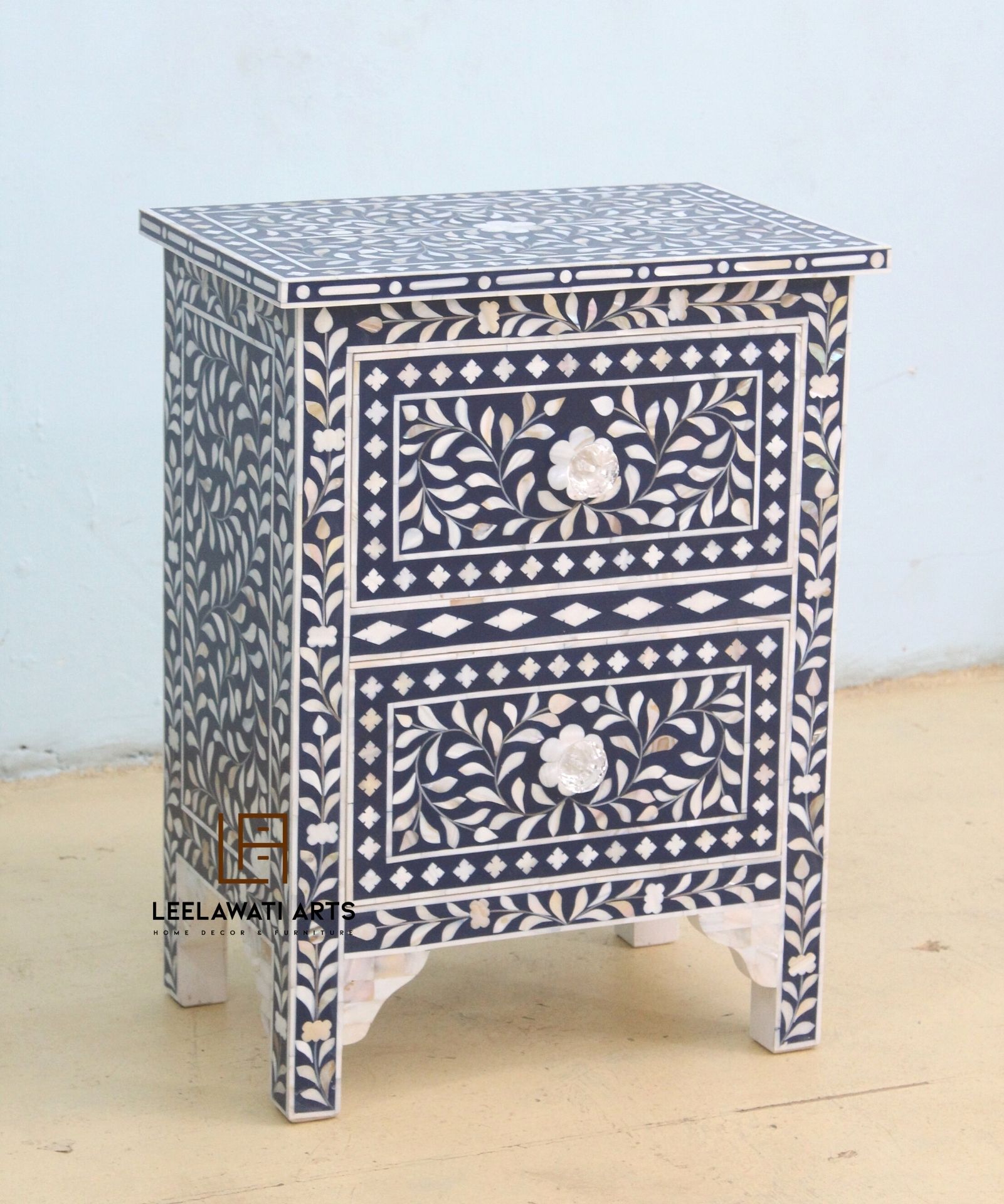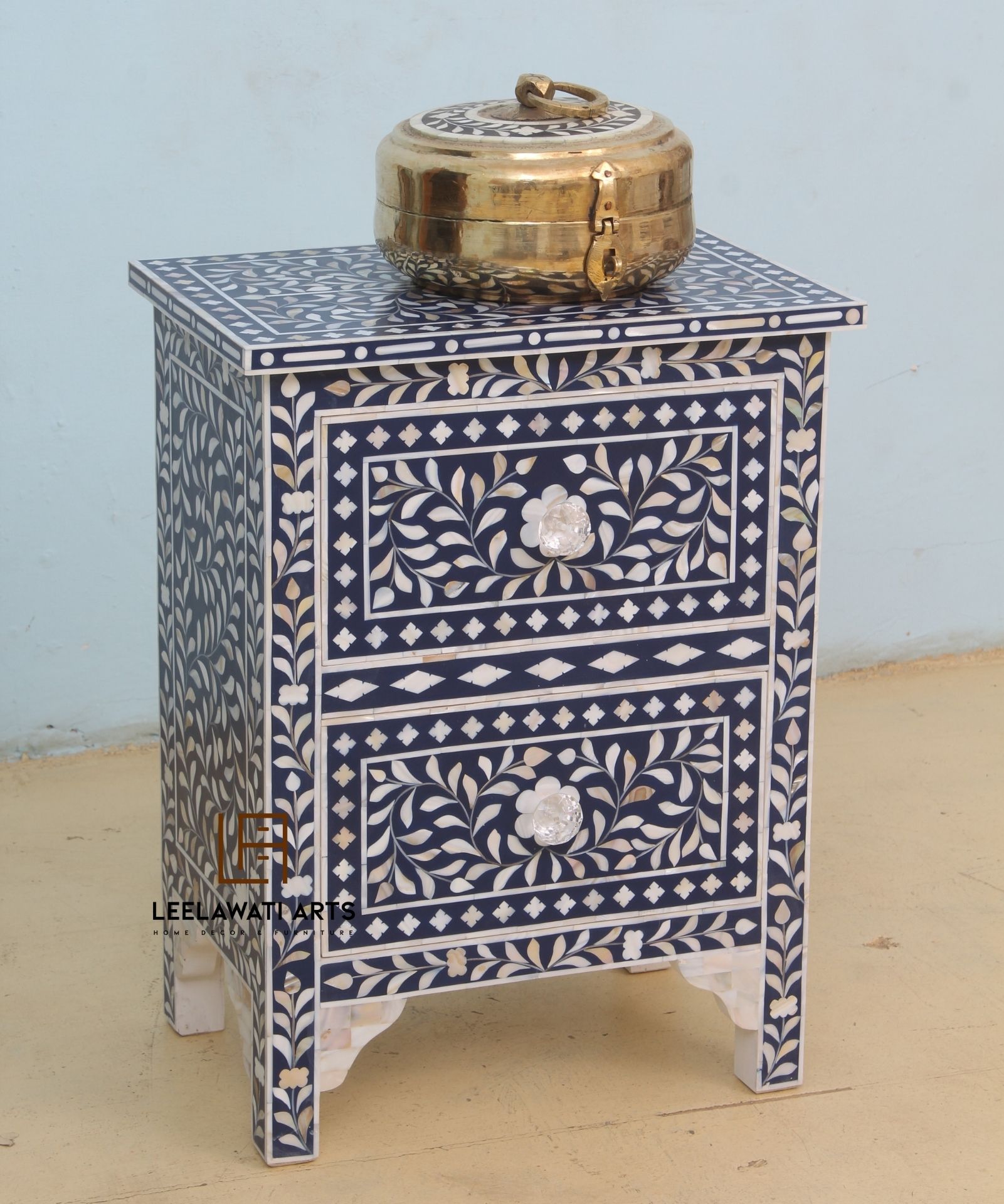 Luxury Wood Mother Of Pearl Inlay Blue 2 Drawer Bedside Table