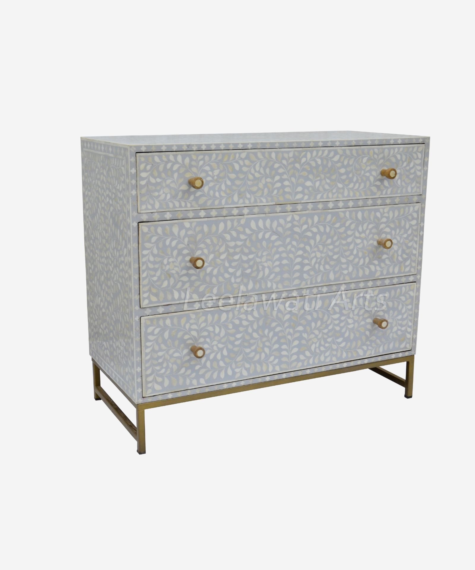 Bone Inlay Floral Design Chest of 3 Drawers Side Table With Iron Legs Grey