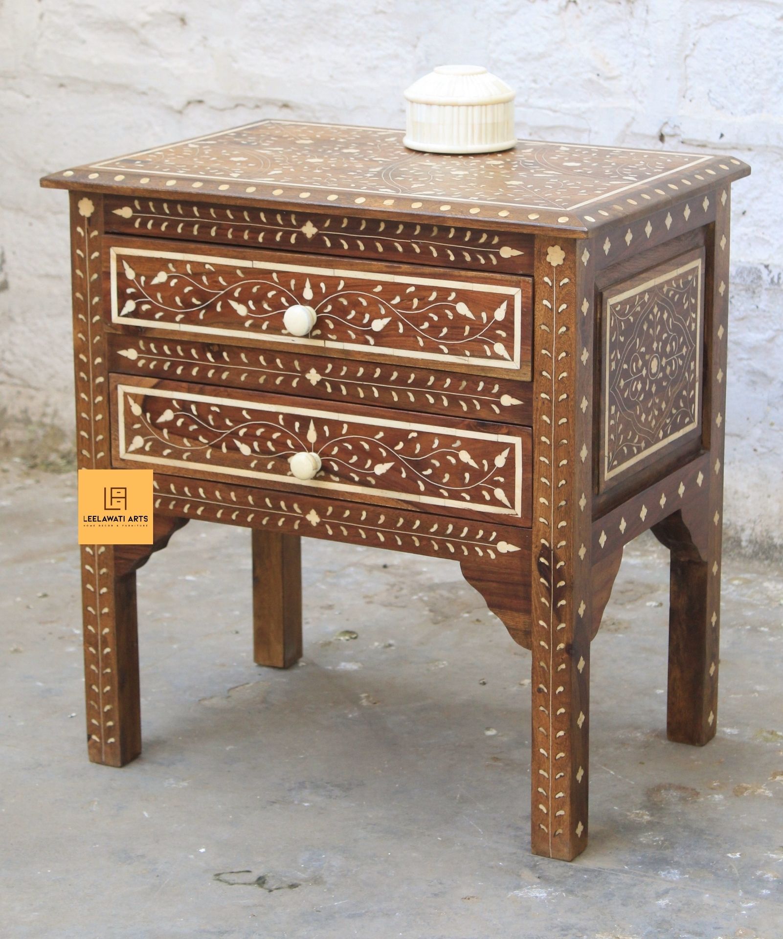 Leelawati Arts : Wooden Bone Inlay 2 Drawer Bedside Table
