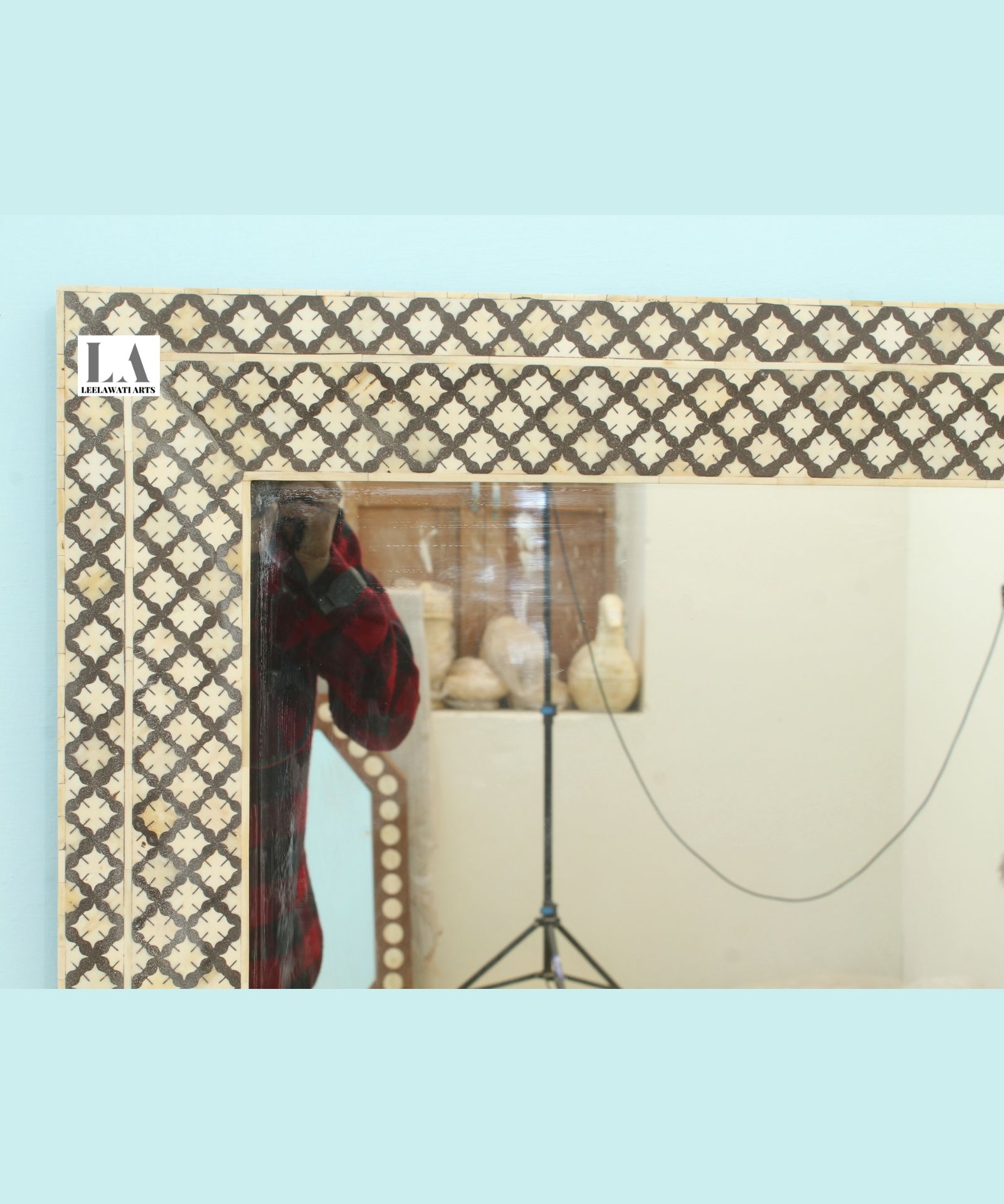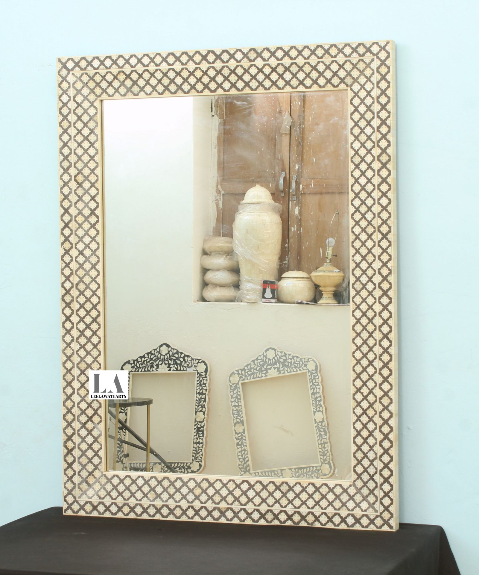 This Piece of Mirror Frame is a classical space for your Kitchen / Living Room / Bedroom/ Dining area. Its Design with Ethnic Luxury Carving pieces of bone and resin finish give