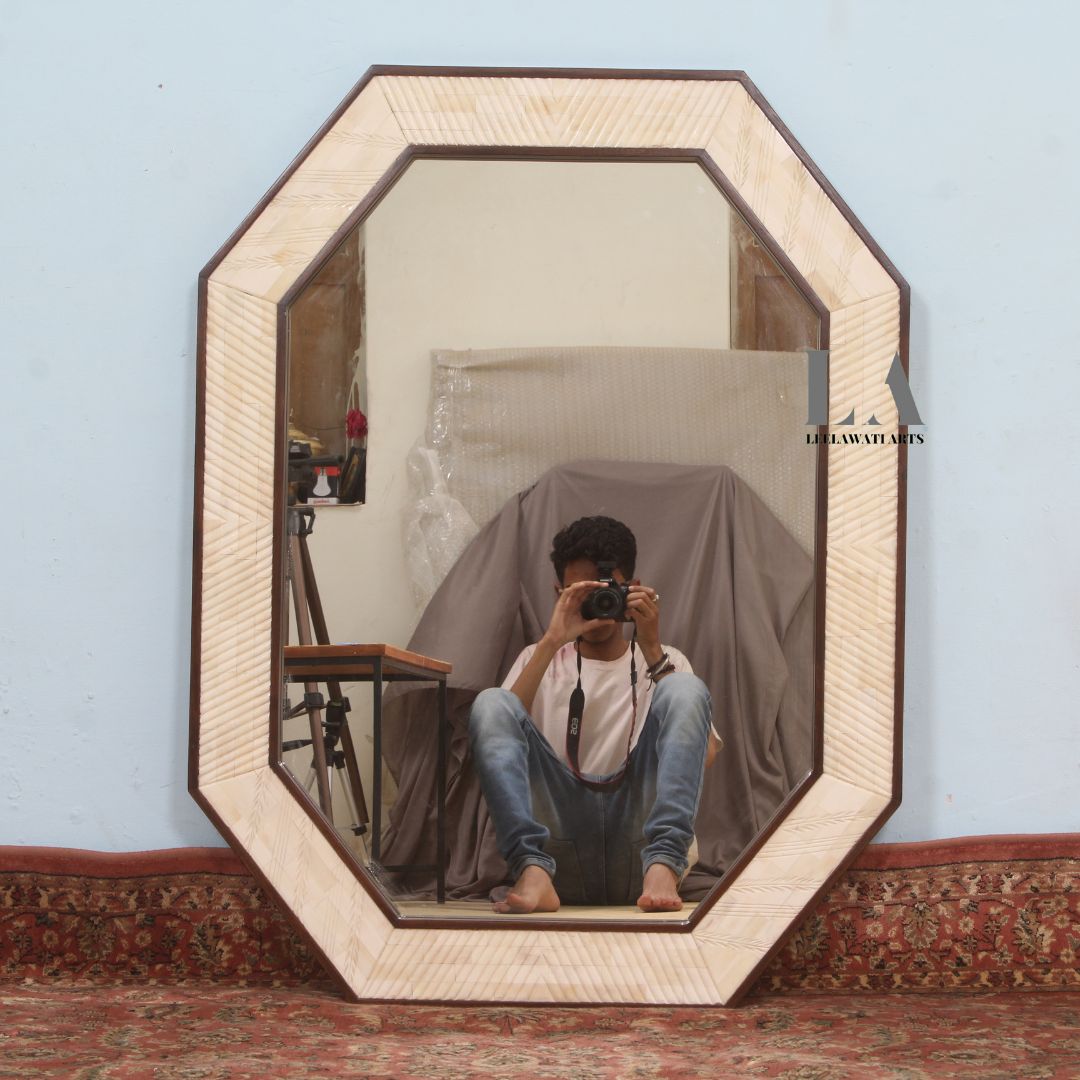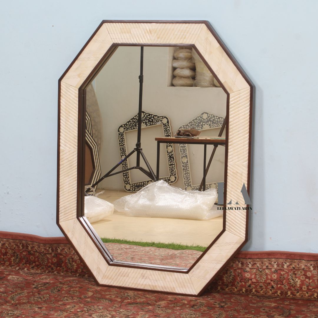 This Piece of Mirror Frame is a classical space for your Kitchen / Living Room / Bedroom/ Dining area. Its Design with Ethnic Luxury Carving pieces of bone and resin finish give