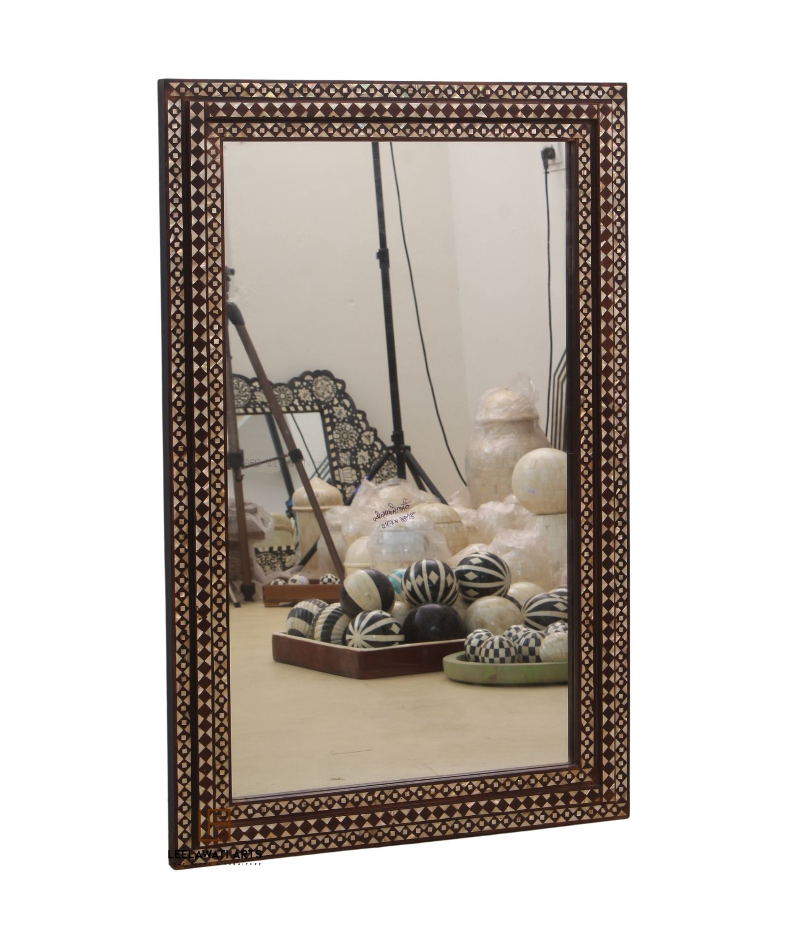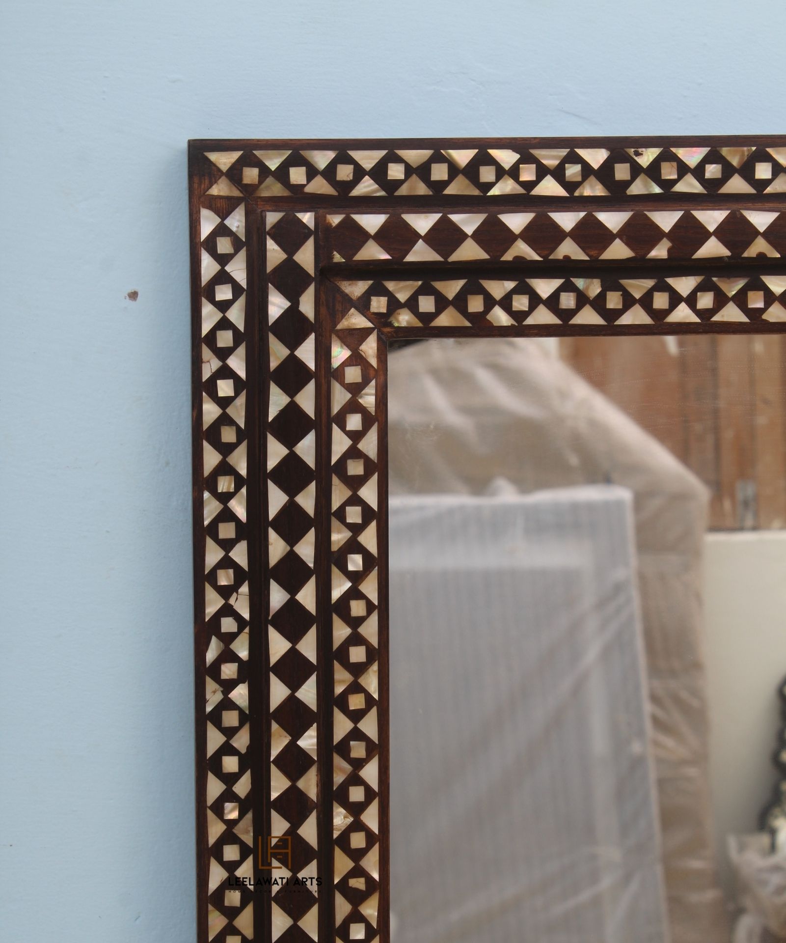 This Piece of Mirror Frame is a classical space for your Kitchen / Living Room / Bedroom/ Dining area. Its Design with Ethnic Luxury Carving pieces of bone and resin finish give