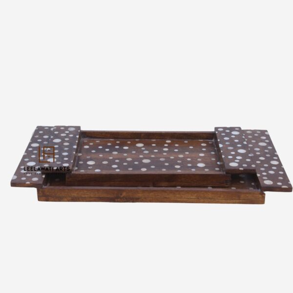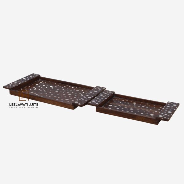 This Piece of bone inlay Tray is a classical space for your Kitchen / Living Room / Bedroom/ Dining area. Its Design with Ethnic Luxury Carving pieces of bone and resin finish give